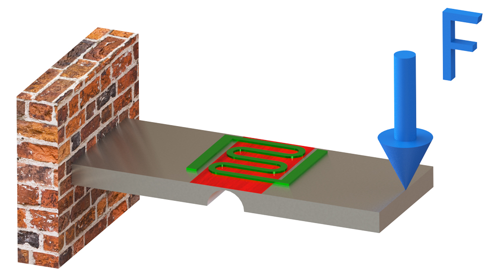 Auf Grundlage der elastischen Verformung eines Körpers unter Krafteinwirkung nach dem Hook'schen Gesetz arbeitet auch der Kraftaufnehmer mit Dehnungsmesstreifen (DMS). Hierzu wird ein Federkörper so konstruiert, dass einzelne eng eingegrenzte Bereiche des Körpers bei Krafteinleitung einer relativ stärken Verformung unterliegen. Dadurch wird die Oberfläche des Körpers in diesem Bereich gedehnt oder gestaucht. An der Stelle der maximalen Dehnung wird ein Widerstand in Form eines DMS aufgebracht, dessen elektrischer Wiederstand (R) mit zunehmender Dehnung steigt.