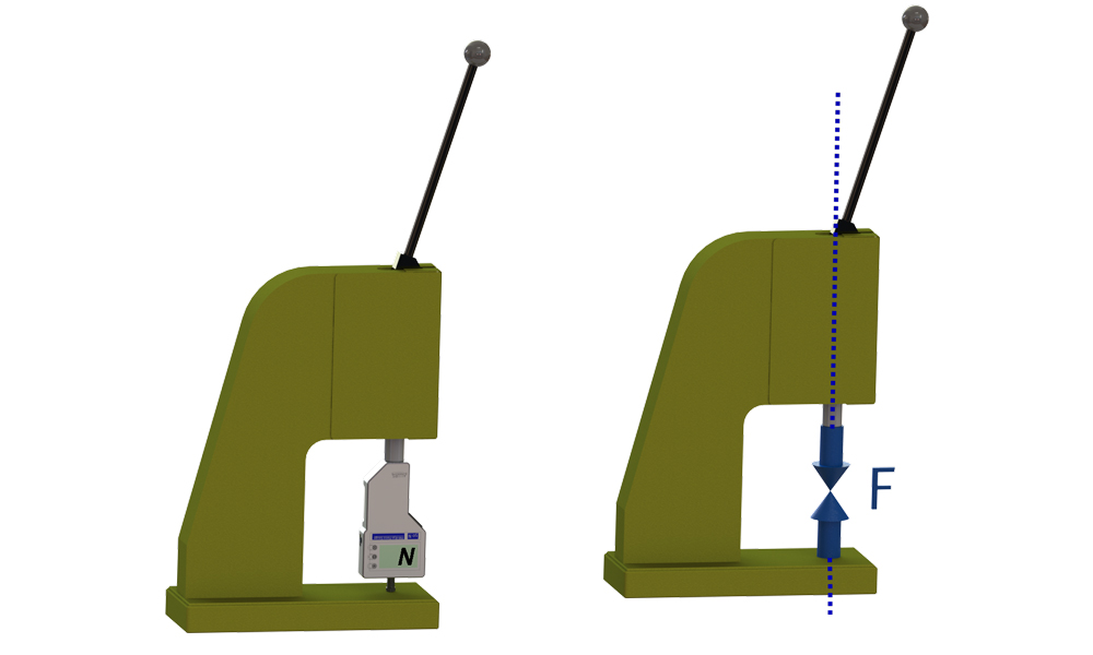 Beispiel: Direkte Kraftmessung mit Kraftmessgerät in der Kraftachse einer Hebelpresse