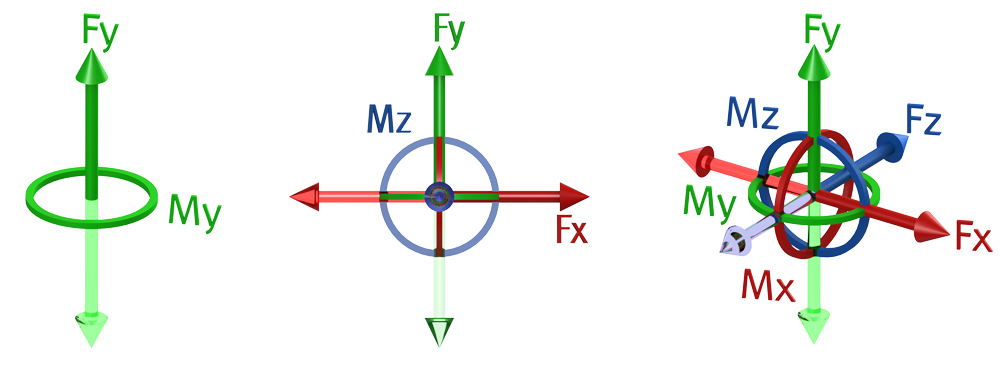 Kraft ist eine vektorielle Größe, die in alle drei Richtung des Raumes wirken kann. Mehrachsige Kraftaufnehmer bieten die Möglichkeit die X-, Y-, und Z-Komponenten und ggf. das jeweilige Drehmoment auszuwerten.